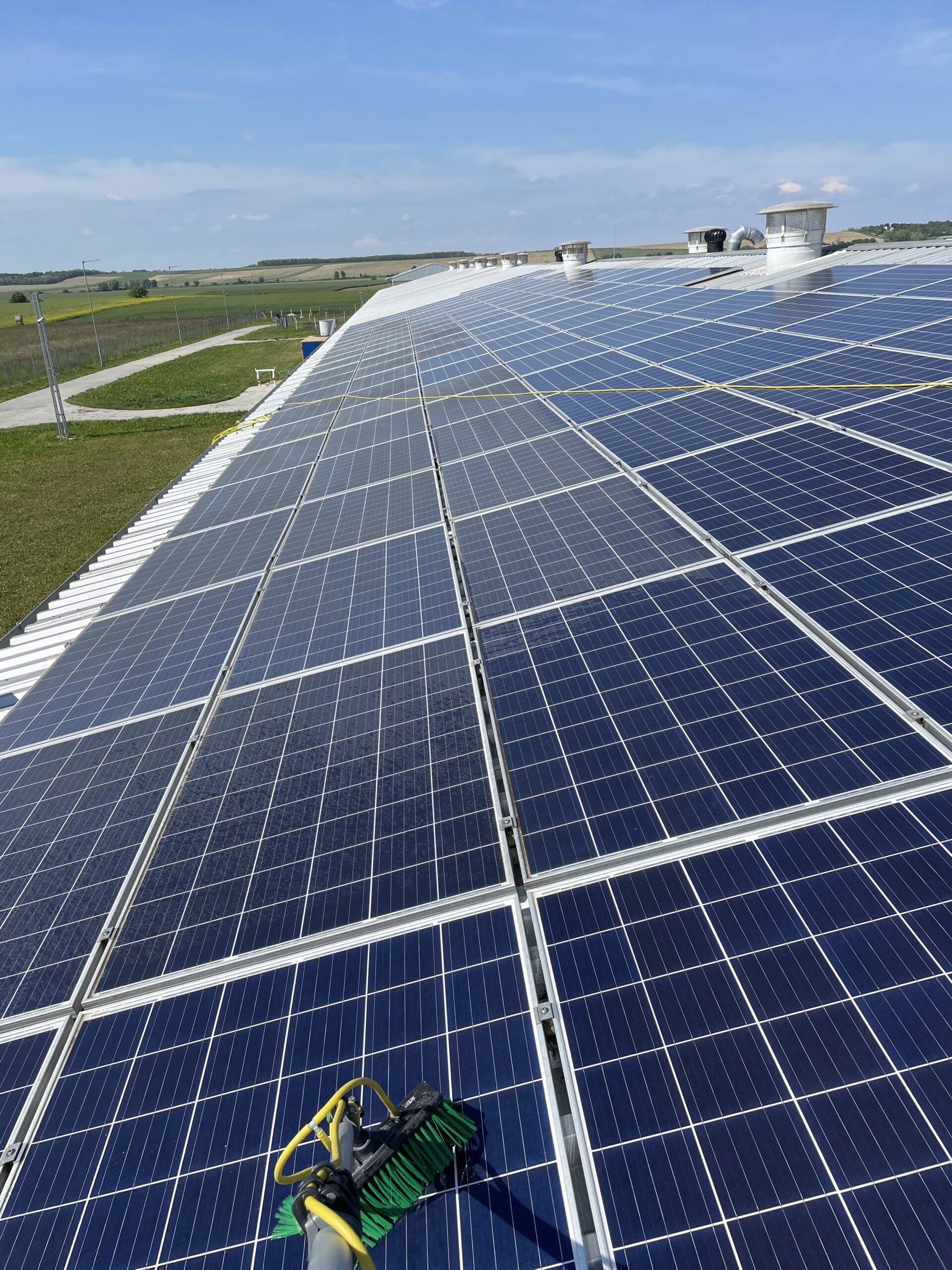 Napelemek tisztítása szűrt, tisztított vízzel, a foltmentes száradásért.